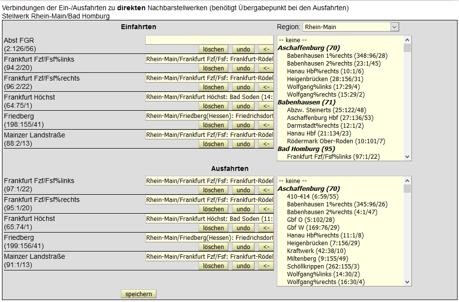 Voraussetzung ist für beide Anlagen ein existierendes Gleisbild mit Einfahrten, Ausfahrten und Übergabepunkten. Hier werden die Einfahrten und die Übergabepunkte des eigenen Gleisbilds mit den Übergabepunkten und Einfahrten der anderen Anlagen verknüpft. Dazu wählt man oben rechts die Region aus, selektiert einen Eintrag in der rechten Liste und drückt in der entsprechenden linken Zeile den Pfeil nach links „←“. Dadurch wird die fremde Ein- bzw. Ausfahrt in das passende Eingabefeld übernommen. Die Eingabefelder sollte man unangetastet lassen, sie sind nur zur Anzeige da. Löschen kann man die Zuordnung mit dem Button „löschen“, der Knopf „undo“ setzt den Inhalt auf den ursprünglichen Wert zurück.