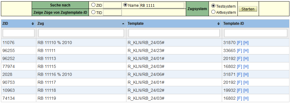 Mit der Zugsuche kann anhand eines Zugnamens, einer ZID (Zug-ID) oder Zugtemplate-ID (TID) nach den erzeugten Zügen sowie deren Zugtemplate gesucht werden.