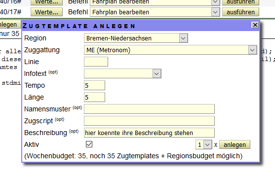 • Ist diese Grenze erreicht, kommt das Regionsbudget ins Spiel. Dieses Budget ist ein Zähler, der hochgezählt wird, wenn Templates der Region gelöscht wurden. Ist das Regionsbudget > 0, kann für diese Region ein Template angelegt werden, auch wenn die persönliche Grenze erreicht wurde. Dadurch kann man durch das frühere Löschen von Templates ermöglichen, dass man etwa viele Regionallinien innerhalb kurzer Zeit nachzubaut.