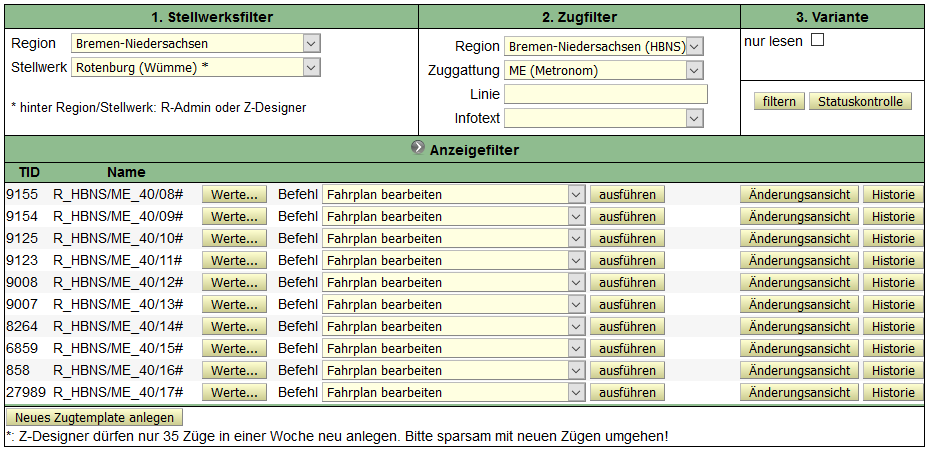 Wurden ein Filter ausgewählt, werden die passenden Zugtemplates angezeigt. Neben der Anzeige der Zugtemplate-ID (TID) und des Namens werden hier folgende Möglichkeiten angeboten: